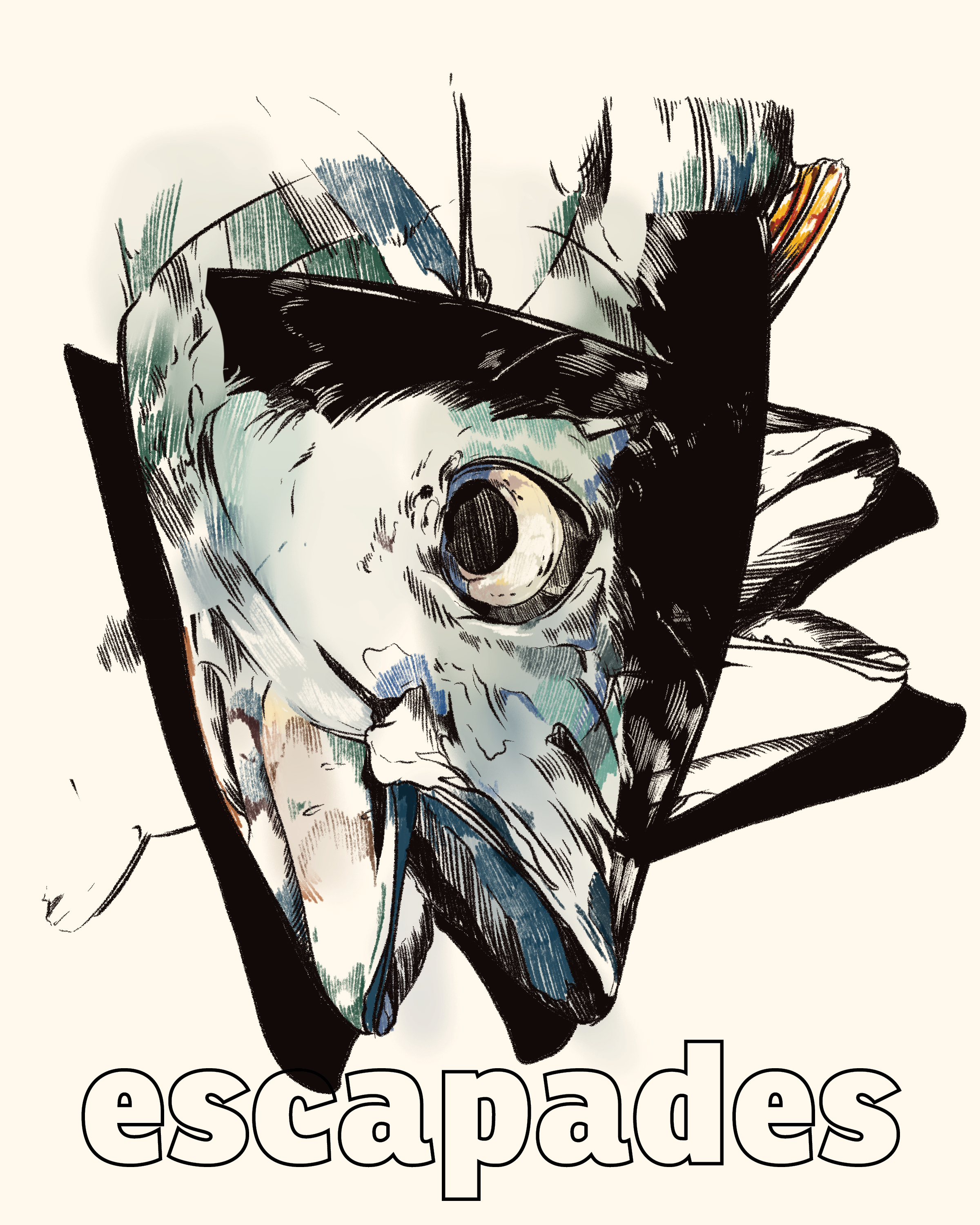 At the center of the table is an oblong porcelain dish. There is a fish set atop the plate with deep emerald scales. The green is reminiscent of wet moss pressed against bark, nourished and rich after a heavy rain. Looking down, I meet its gaze, one striking yellow eye staring back at me diligently, with intent. I begin to sweat; slowly the beads trickle from the base of my neck down my back and join the sea. The eye dances, towards me and then stares blankly at the sun. Back and forth, all the while the heat against my neck remains, but the sweat seems to stifle. To me, then the sun. Gentle waves cool the tops of my legs as my knees occasionally breach the surface. With a deep breath, I avert my focus back out towards where the sky and ocean meet as their congress forms one singular blue. My toes curl and I feel sand beneath me.